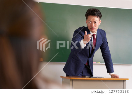 一位穿著西裝的男老師表情嚴肅地發出指令