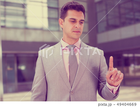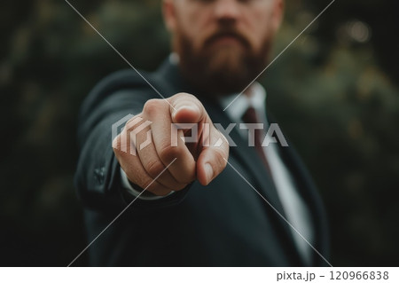 Businessman points his finger. To attract attention. To confidently show what to pay attention to. Space for text, copy space, leadership concept, business direction, decision making.