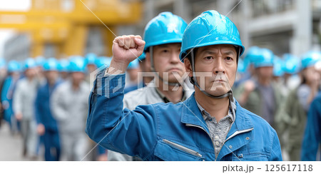 Factory worker blue helmet protest industrial determined outdoor group uniform Factory worker