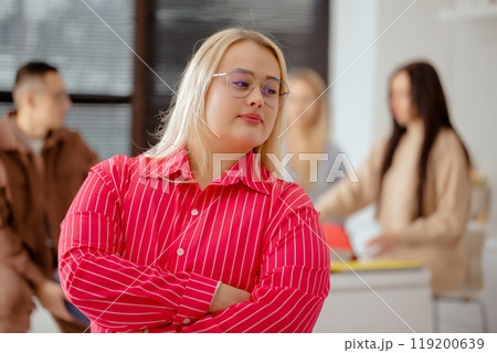 A self-assured woman adopts a commanding stance, prepared for a conference