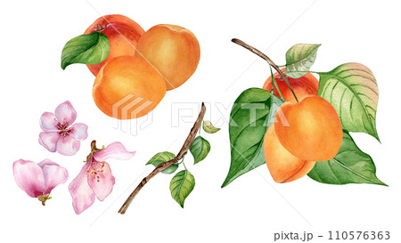 Watercolor set of fresh various fruits and apricots on tree branch isolated on white. Illustration of orange fruits hand drawn. Flower of apricot tree and branch drawn. Elements for package, label