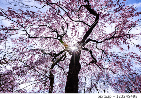 優雅盛開的垂枝櫻花在春日陽光下閃閃發光