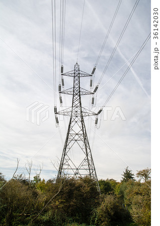 站立在一個混雜的森林裡的一個大鋼塔在英國之外的鄉下