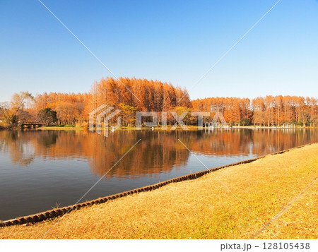 從水裡公園望去,深秋的水元公園與對岸水杉的黃葉交相輝映