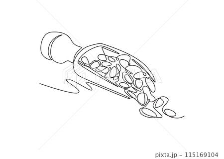 Single one line drawing of pile healthy organic goji berries on seed spoon for orchard logo identity. Fresh gojiberry fruitage for fruit garden icon. Continuous line design graphic vector illustration