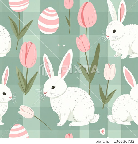 Generated Spring Bunny with Pink Striped Egg and Mini Tulips Seamless Gingham Pattern