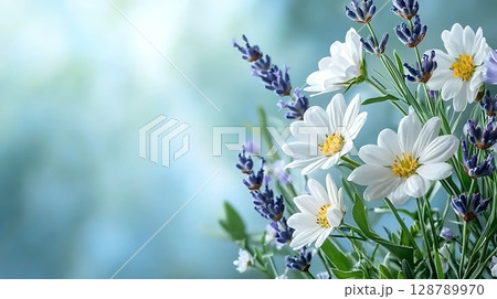 Beautiful arrangement of white daisies and lavender flowers on blurred background