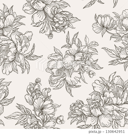 Soft pink peonies gracefully intertwine with lush green leaves, creating a serene atmosphere filled with delicate charm and artistic flair seamless pattern, ornament