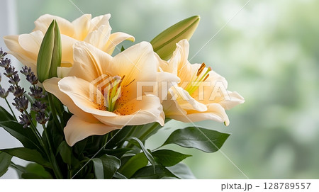 Soft Peach Lilies and Lavender in a Fresh Floral Arrangement Against a Natural Background