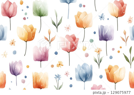 Colorful Watercolor Floral Pattern with Various Blooms and Leaves on White Background