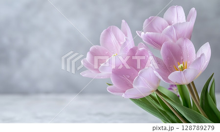 Fresh Pink Tulips with Dew Drops on Soft Gray Background for Nature and Floral Design