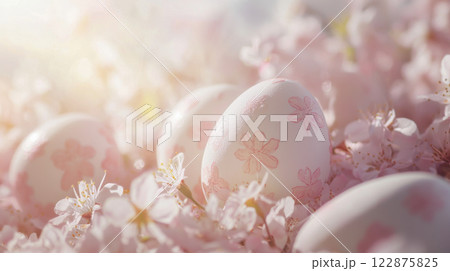 Easter eggs decorated with pink floral patterns surrounded by cherry blossoms