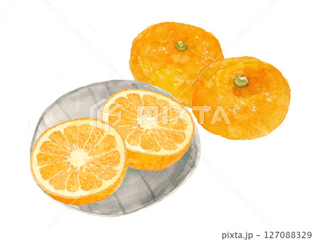 用水彩畫成的盤子上切成兩半的甘夏的插圖素材[手繪]白色背景複製空間以供切割