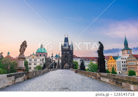 Prague Czech Republic, sunrise city skyline at Charles Bridge, Czechia with autumn foliage season