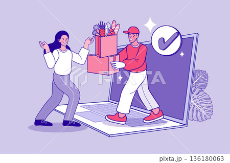 Online e-commerce grocery delivery service concept. Courier delivering food boxes from laptop screen to woman. Flat vector illustration for fast shipping and digital shopping success.