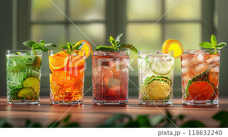 Summer drink selection in different glassware on a bar table, high resolution