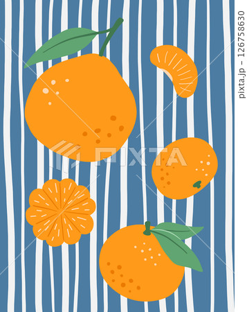 Poster with tangerine with leaves, fruits on striped background. Vector illustrations of citrus.