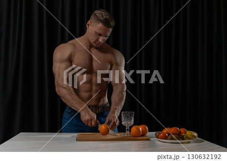 In a contemporary kitchen a muscular man is focused on cutting oranges. He stands at a white countertop preparing nutritious food. A bowl of fruits is nearby highlighting healthy eating.