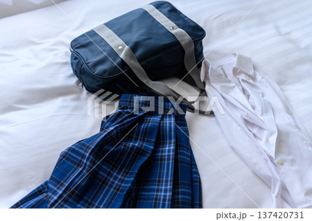 一幅簡潔優雅的女學生肖像,背景為純白色;留有影印空間。