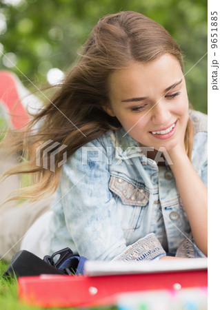 Portrait of young adult woman, reading her notes, holding notebook and smiling, relaxing at home