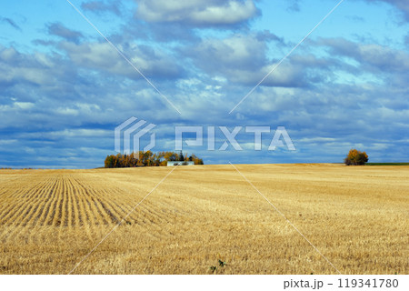 Late autumn scenic landscape in prairies - agricultural field with stubbles after wheat harvesting and a little farm around trees in the horizon, blue cloudy dramatic sky.