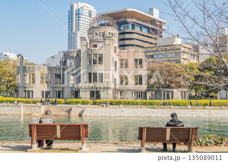 廣島縣廣島市春天的廣島和平紀念公園,櫻花盛開,原爆圓頂穹頂橫跨元安川