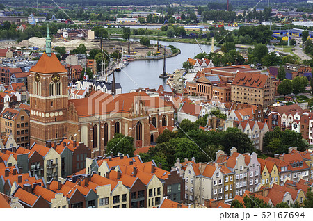 Aerial panoramic view of the Historical Old City of Gdansk. Red rooftops and colorful house