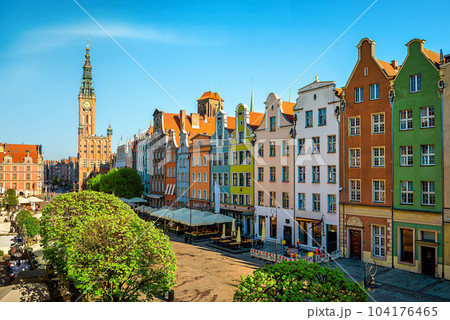 View of Dlugi Targ or the Long Market, the main tourist attraction of Gdansk, Poland. Many beautiful old houses including the Town Hall and Artus Court.