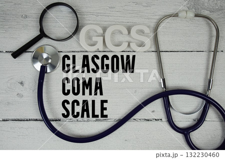 GCS Glasgow Coma Scale text with Stethoscope on wooden background