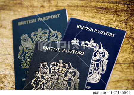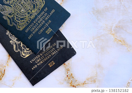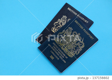 British and Gibraltar passports on table close up. Official identification document books for citizens of United Kingdom. Concept of travel and tourism