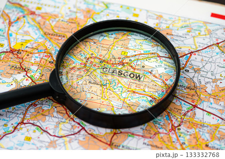 map of Glasgow in Scotland through magnifying glass, travel destination concept