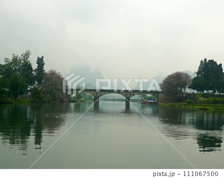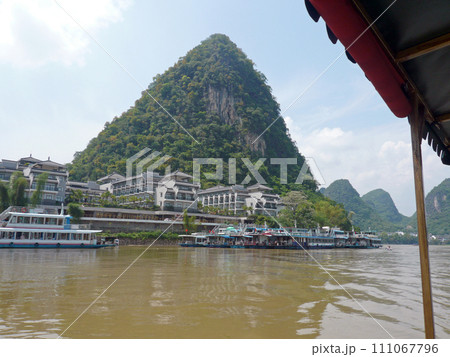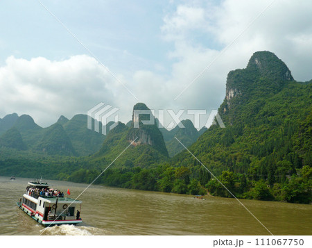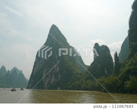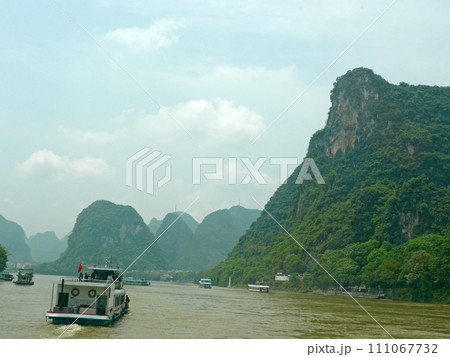 在中國桂林坐船到陽朔拍攝兩岸美麗的山景與船隻
