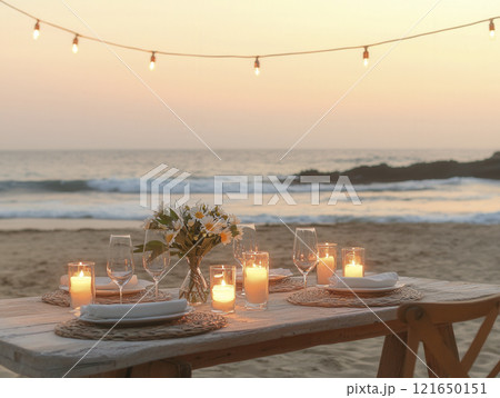 romantic dinner setup on beach with candles and flowers at sunset