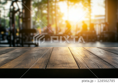 A close-up of a wooden table surface in the foreground, with a blurred gym interior and sunlit windows in the background.
