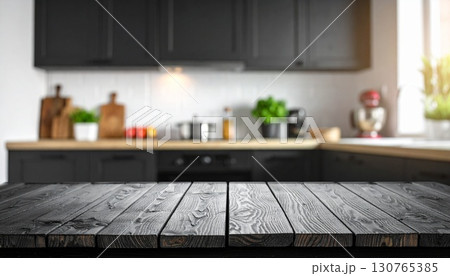Empty space on a tabletop with a blurred background of a modern kitchen.