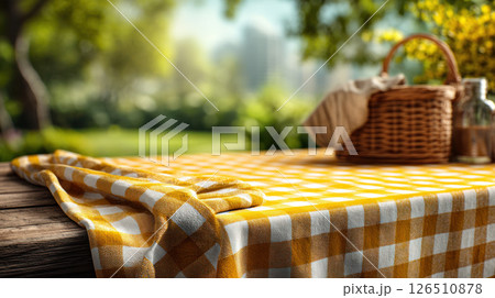 Vibrant yellow and white checkered tablecloth covers wooden outdoor table with picnic basket and glass jar, set in sunny green park