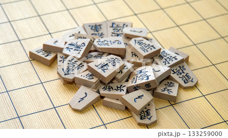 擺放在木製將棋棋盤上的棋子