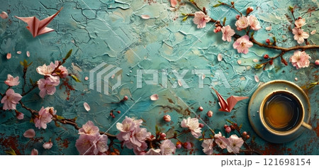a textured, turquoise background, delicate pink cherry blossom branches and two origami cranes frame a rustic blue coffee cup, evoking a sense of tranquility and artistic beauty.