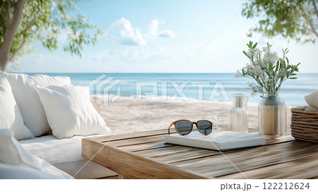 serene beach scene featuring cozy seating area with book, sunglasses, and vase of flowers