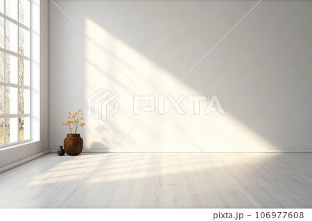 Warm sunlight streaming in through the window, beige background, flowers, vases, and a table with plants. Harmony of light and shadow.