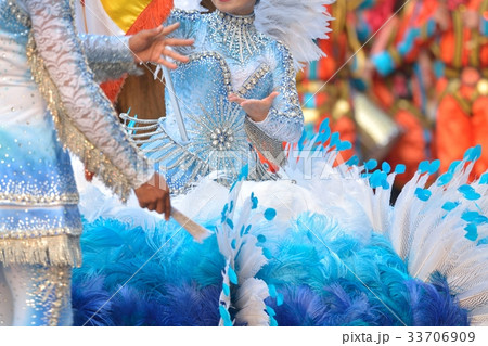 Close-up shot of a carnival performer wearing an intricate and ornate costume