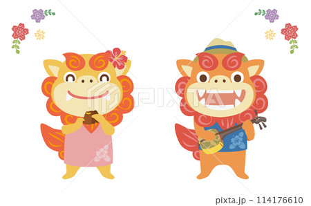 Shisa 在沖繩 sanshin 和 sanban 上玩/向量插圖