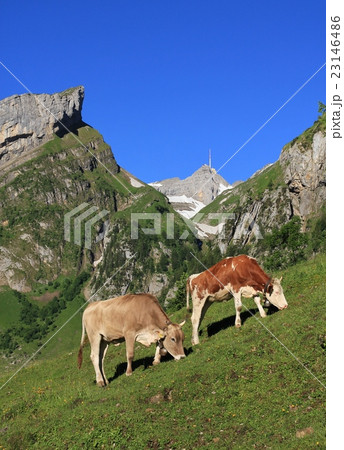 Idyllic landscape in the Swiss Alps with Saentis mountain peak in the background in summer