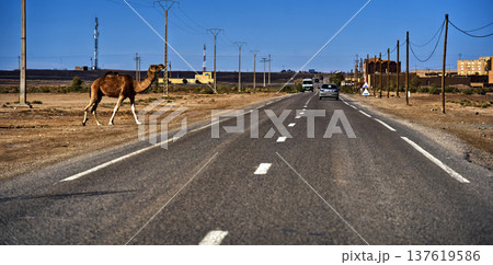 Camel crossing desert road in moroccan landscape