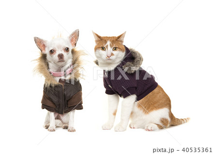 Cat and chihuahua dog wearing winter coats