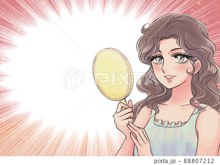 Shojo 漫畫風格的美容廣告插圖・ 一個美麗閃亮的女人帶著鏡子的眼睛
