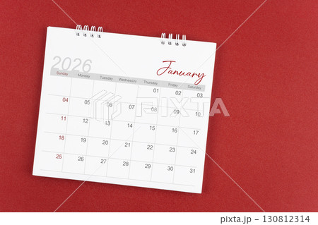 January 2026 desk calendar on red background. Page of annual monthly calendar for plan.
