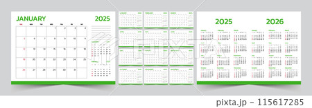 Monthly calendar template for 2025 and 2026 year. Desk calendar 2025 and 2026 design, simple and clean design, Wall calendar for print, digital calendar, Corporate design planner template vector.