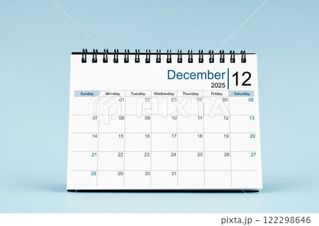 December 2025 Monthly desk calendar for 2025 year on soft blue background.
