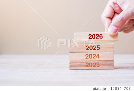 2026 block over 2025 and 2024 wooden building on table background. Business planning, Risk Management, Resolution, strategy, solution, goal, New Year New You and happy holiday concepts
